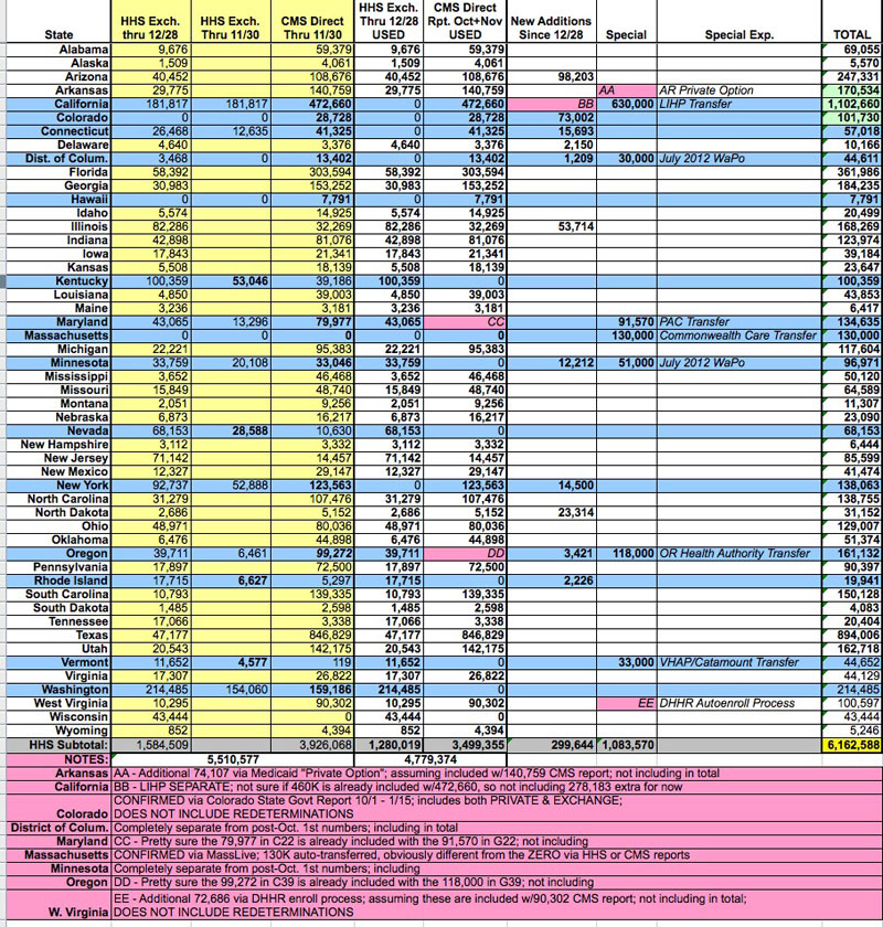 Instead, I concluded that the actual grand total number is closer to well over 6 million, when you include all enrollments: Federal exchange-based; State exchange-based; Direct enrollments via the regular state Medicaid offices; special/one-time automatic transfers of people from existing state-level healthcare programs (such as LIHP in California and Commonwealth Care in Massachusetts), and more recent Medicaid enrollment data which has come over the 3 weeks since the 12/28 date cut-off in the HHS report.