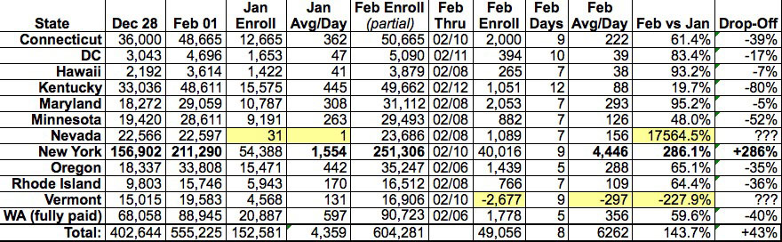Finally, there's another major factor...New York is actually showing a massive enrollment increase in February so far: Over 40,000 from 2/02 - 2/10, or over 4,400/day, which is way up from the 1,500/day that it averaged in January.