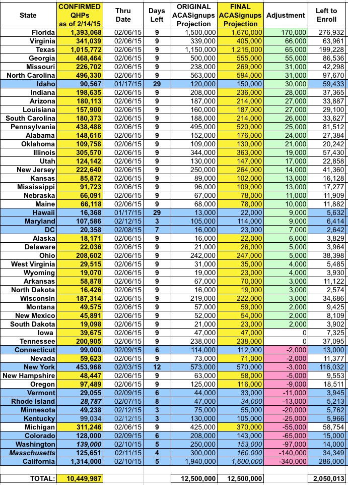 • FLORIDA: Holy smokes...as I noted in my most recent healthinsurance.org exclusive, Florida was already 41% ahead of their 2014 tally as of 8 days ago, and their enrollment outreach machine shows no sign of stopping. I've increased my final target for FL from 1.5M to 1.67M...a 70% increase over last year's tally.