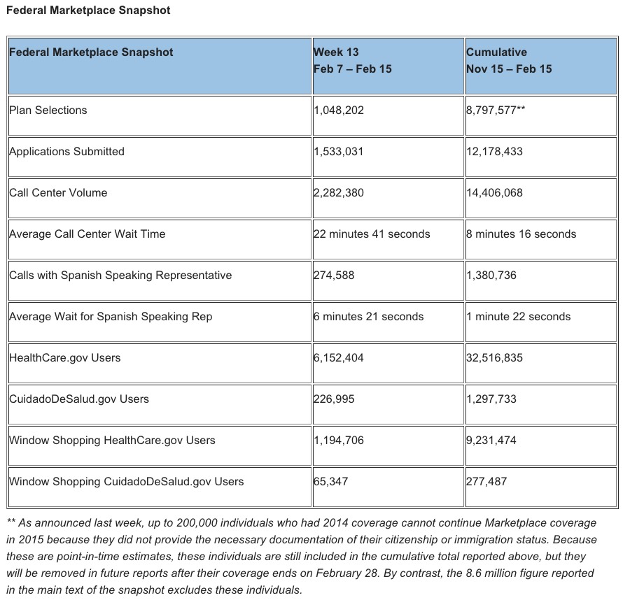 Of the 11.4 million, 8.6 million consumers selected a plan or were automatically re-enrolled in the 37 states that use the HealthCare.gov platform. In addition, preliminary analyses of data provided by State-Based Marketplaces show that about 2.8 million consumers selected plans or were automatically re-enrolled between November 15 and February 15 in those states. Further details about plan selections from State-Based Marketplaces may be announced by the states and will be included within the upcoming monthly enrollment report.