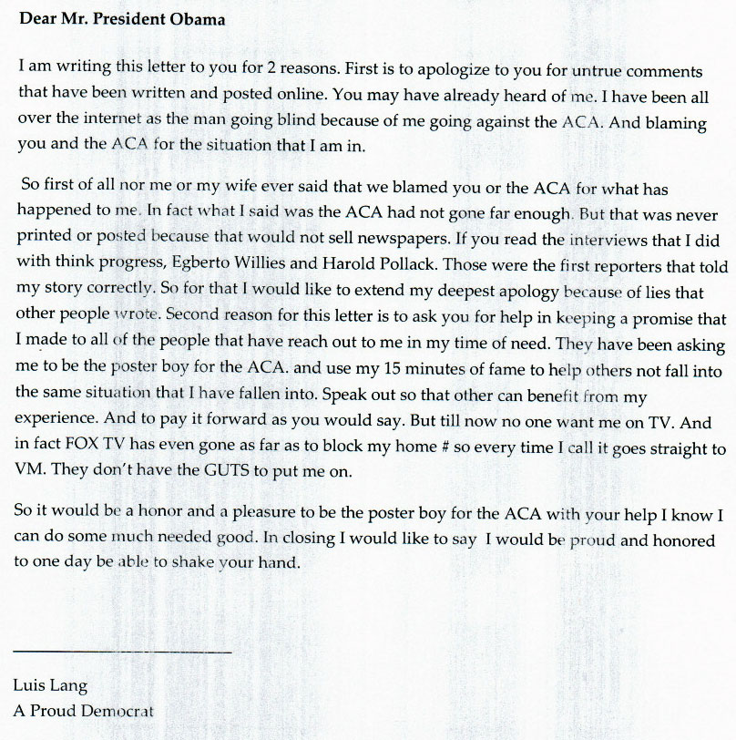 The original story in the Charlotte Observer, and some of the subsequent stories about the Langs made it sound very much as though Lang and his wife were die-hard conservatives who hated President Obama and the Democrats for passing the ACA. In particular, his wife was quoted as saying "“[Luis] should be at the front of the line because he doesn’t work and because he has medical issues...we call it the Not Fair Health Care Act.”