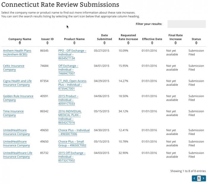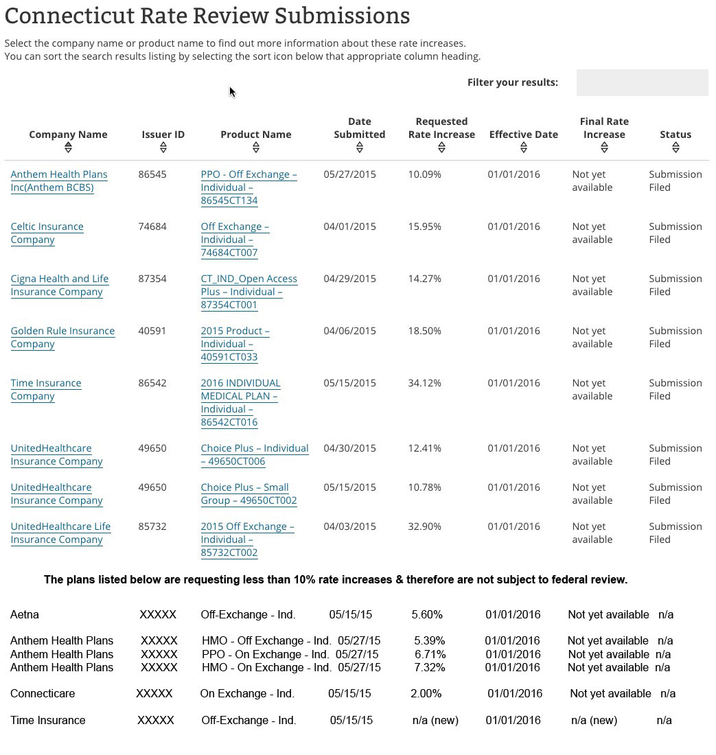 Case in point: Connecticut. Here's what it looks like if you use RateReview.Healthcare.Gov as your source for 2016 rate requests: