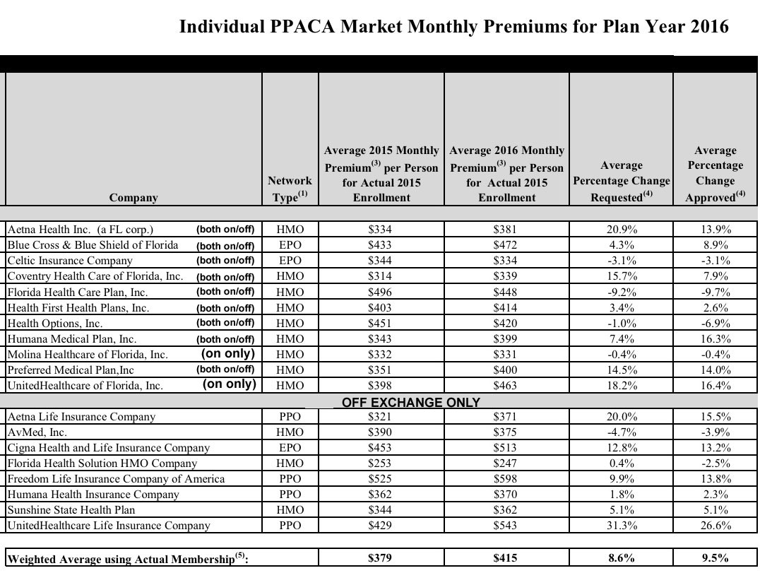 TALLAHASSEE, Fla. – The Florida Office of Insurance Regulation announced today that premiums for Florida individual major medical plans in compliance with the federal Patient Protection & Affordable Care Act (PPACA) will increase an average of 9.5% beginning January 1, 2016. Per federal guidelines, a total of 19 health insurance companies submitted rate filings for the Office’s review in May with final rate determinations due by August 25, 2015. These rate filings consisted of individual major medical plans to be sold both on and off the Exchange. Following the Office’s rate filing review, the average approved rate changes on the Exchange range from a low of -9.7% to a high of 16.4%. This information can be located in the “Individual PPACA Market Monthly Premiums for Plan Year 2016” document.