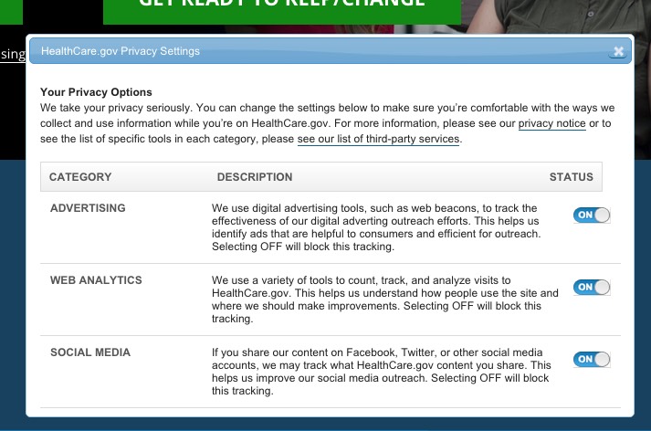 We’re committed to providing you with the opportunity to personalize your experience. Here are a few of the updates you can expect from HealthCare.gov. Today, we launched a simple way to give you more control over the information you choose to share with us – a new privacy manager. We’re also supporting the Do Not Track browser setting for our digital advertising. And, you can check out our updated privacy notice to learn more about these tools and to understand the steps we’ve taken to protect your privacy. We tried to make the policy easy to navigate while also being a lot more specific.