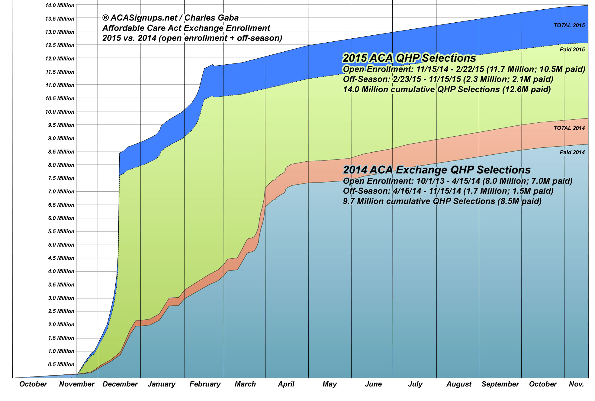 In general, however, it's been averaging roughly 8,000 - 9,000 new QHP selections per day during the off-season, and will likely continue at about that rate for another few weeks (hitting roughly 13.9 million by the end of October) before tapering off as the 2016 enrollment season kicks into gear. I'm pretty certain that it'll close out the year with around 14 million QHP selections even, of which around 12.6 million will actually be paid for and around 9.7 million will still be enrolled as of the end of December.