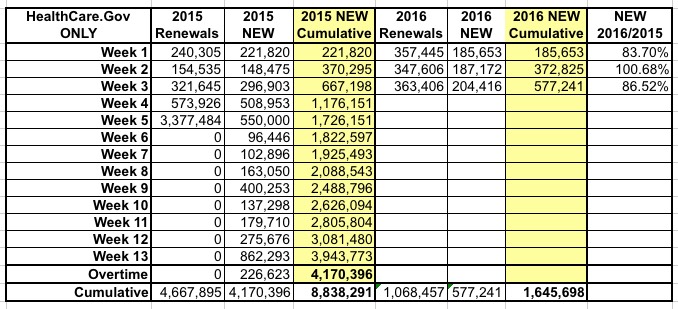 Graham is correct: While the 2nd week saw new enrollees slightly above 2015, for all 3 weeks combined it's down 13.5% year over year so far. There are a few factors which make this not a strict apples-to-apples comparison, of course; most notably, Open Enrollment started 2 weeks earlier this year, which means a) the Thanksgiving weeks don't match up (I expect a 30%+ drop in overall enrollment for the current week) and b) there are 2 additional weeks before the deadline for January coverage (12/15). In addition, these numbers are all for HealthCare.Gov only, which means they don't include roughly 25% of the total enrollments (via the State-based Exchanges)...and the renewal-vs-new ratios don't always match up.