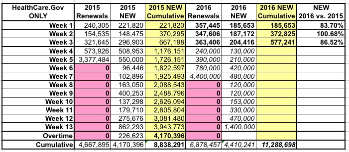 We won't know the renewal number until after the 12/15 numbers come in, which will be during Week 7 (12/13/15 - 12/19/15). That number probably won't be released until Wednesday, 12/23. However, even then, there's absolutely no way of knowing what will happen with the new enrollee number until after the dust settles at the end of January/ Once again, last year I nailed 12 out of 13 weeks pretty much dead-on target...but still fell way short for the final week, even with the "overtime" period tacked on. I thought there would be a massive 2.0 million surge the final week; instead it ended up being only around 1.2 million, coming in 800K short. Anything's possible.
