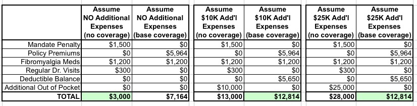 • IF she has no additional healthcare needs, without coverage, her cost will be $1,500, plus her fibromyalgia drugs at full price (I haven't a clue what it costs her...let's say $100/month?), plus, say, $300 for 3 $100 "regular" doctor's appointments = $3,000 total for the year.