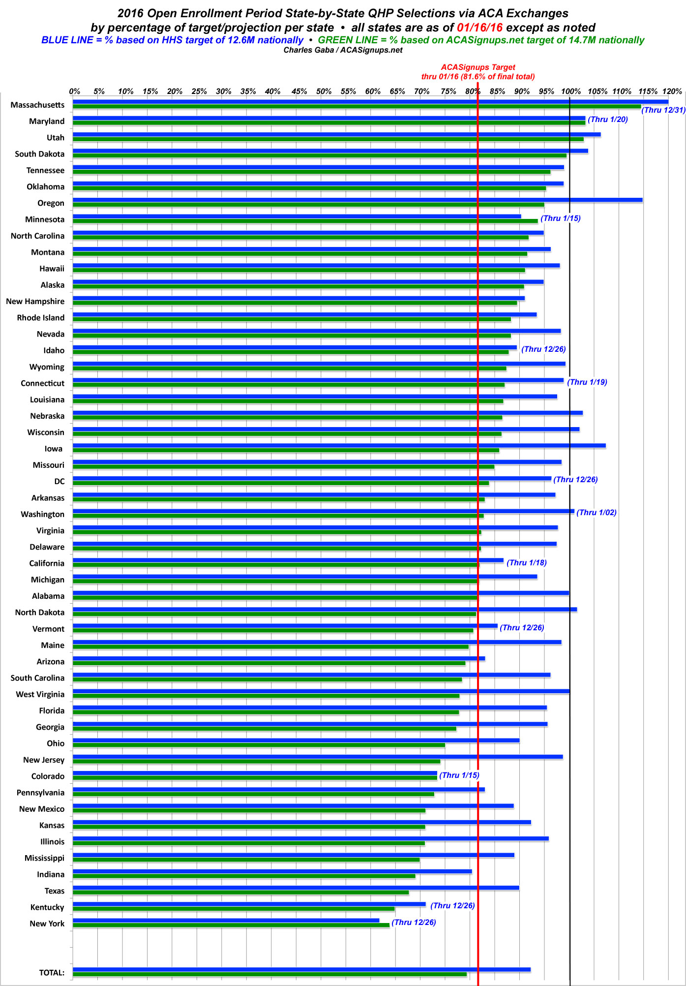 • The BLUE LINES represent the percentage of QHP selections each state had achieved as of January 16th for most states compared to my best guess at their reasonable proportion of the 12.6 million people the HHS Dept. expects to select plans nationally. In some cases (California, Colorado, Connecticut, Idaho, Maryland, Minnesota and Vermont), I've used the official target number for that state, according to the exchange itself. For other states, I took a proportionate number based on the HHS Dept's 12.6 million total.