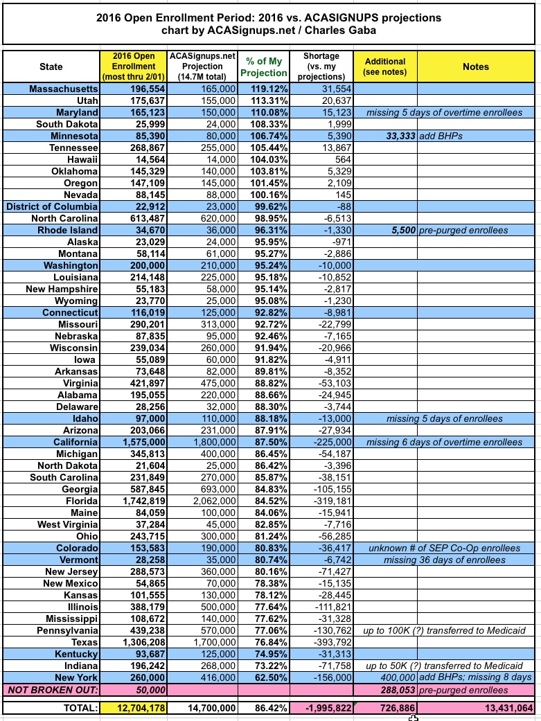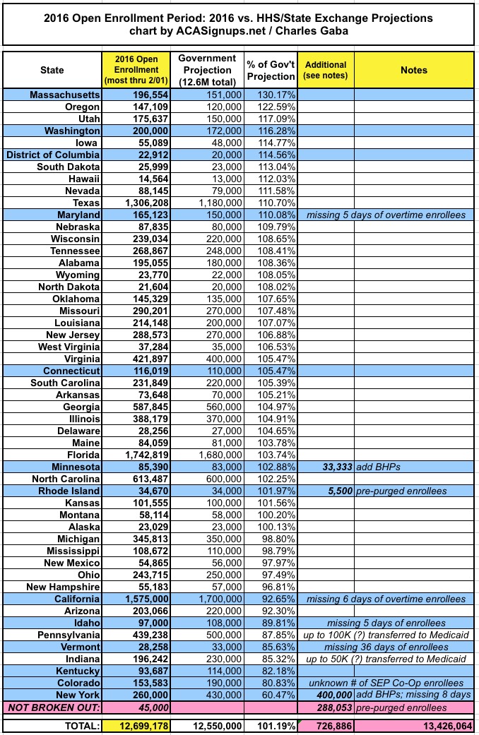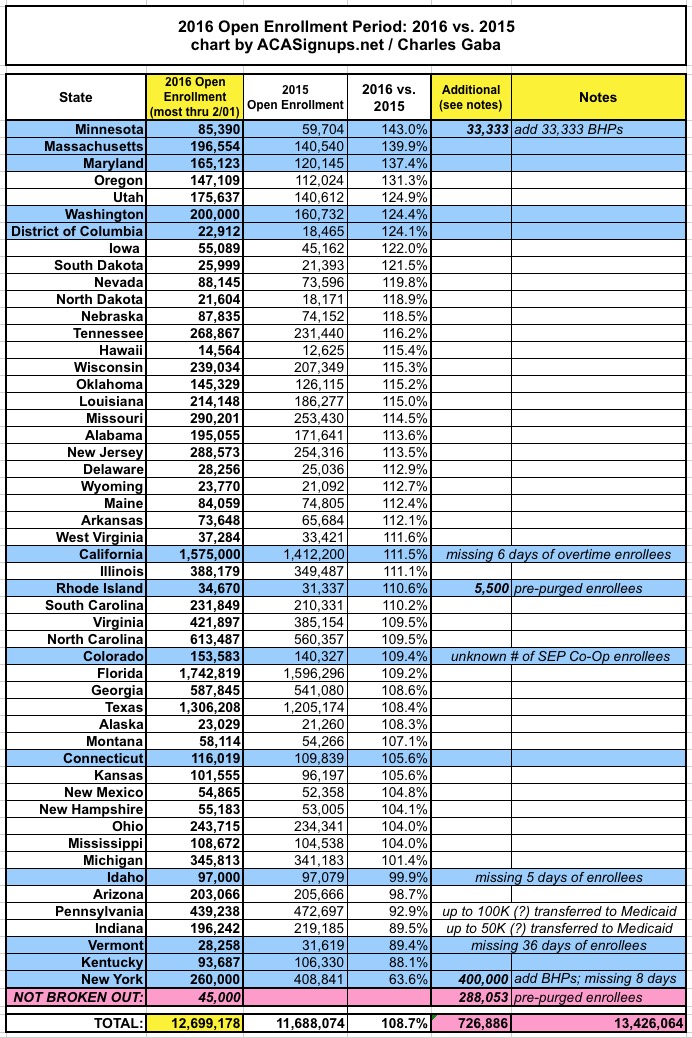 The three "M" exchanges (Minnesota, Maryland and Massachusetts) kicked some major ass this year, with each one enrolling more than 1/3 more people than 2015. Other strong performers (more than a 20% increase) were Oregon, Utah, Washington State, DC, Iowa and South Dakota, although Washington is a bit of a cheat since they actually did the reverse of HC.gov this year; they went from only counting paid enrollees to counting all selections. A true year/year comparison would likely be more like an 11% gain for WA.