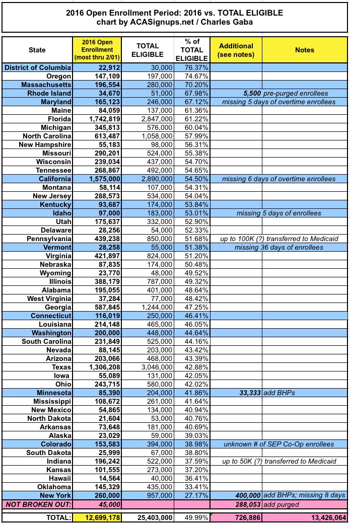 The final numbers (through either 1/31, 2/01 or 2/02 depending on the state) are now in for 44 states plus DC. There are still 6 states which are missing some enrollment data: