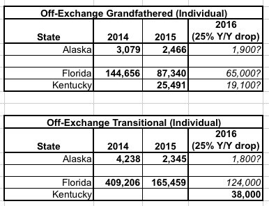 As you'll recall, until now I had data on "grandfathered" and "grandmothered" policy enrollment from 3 states: Alaska, Florida and Kentucky. However, even that limited data is kind of iffy, because most of it is from either 2014 or 2015, making it difficult to pin down the current numbers as of Spring 2016. Here's a summary of what I have so far: