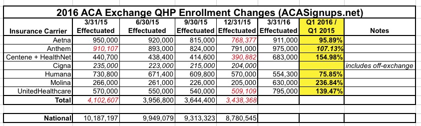 This is probably difficult to read, but the first column is the effectuated enrollment as of 3/31/16: 554.3K exchange-based; 208.7K off-exchange; and 112.7K non-ACA compatible (off-exchange). The second column is the average for the first quarter; the third is where things stood as of 1 year ago, followed by the net and percentage changes.