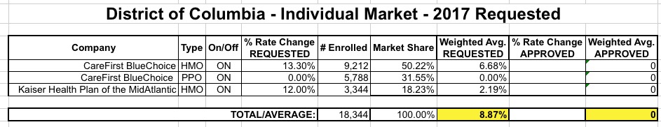 The good news about estimating the DC exchange rate hike requests is that the DC Dept. of Insurance, Securities & Banking is pretty transparent about posting this info, and they keep it simple. It's simpler still because like Vermont, DC requires that all individual and small group policies be sold on the exchange, so there's no off-exchange data to track down.