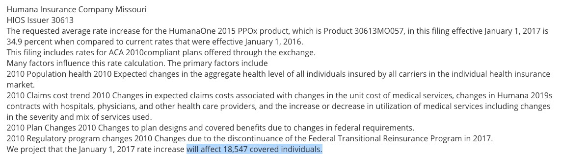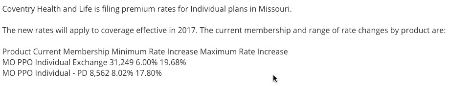 As you can see, not only is each Coventry product listed with a separate and unique "current membership" number, one of these (CareLink & FocustedCare HPN) overwhelms everything else in the state with over half a million members all by itself. I'm not sure what to make of this, but assuming these ratios are somehow accurate, Missouri is looking at roughly 16% average requested rate increases next year.