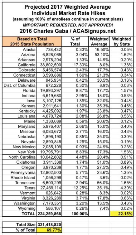 With that in mind, this seems like a good point to take a breather and see where things stand. The 31 states (+DC) that I've analyzed represent either 70%, 72% or 73% of the country depending on whether you base it on the total population, the size of the individual insurance policy market or the total number of QHP selections via the exchanges. I've broken the 3 tables into separate images below to avoid having to click for a higher res version: