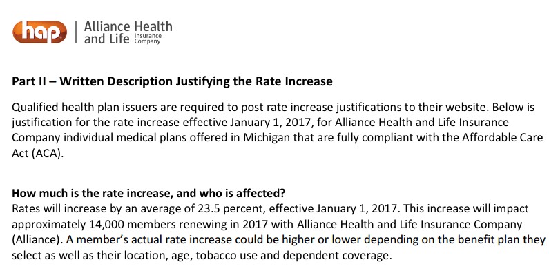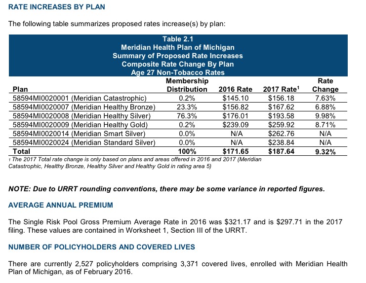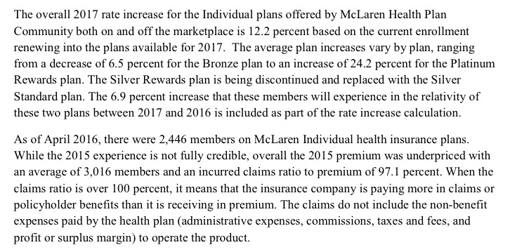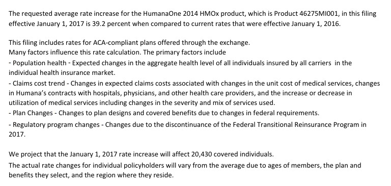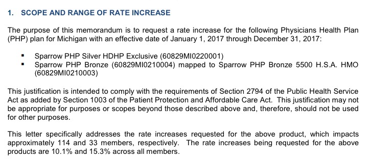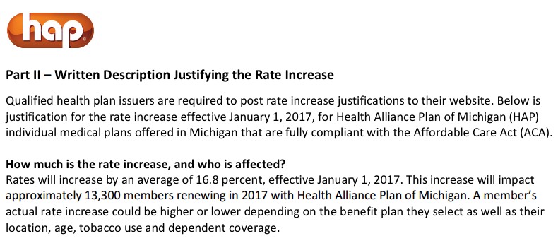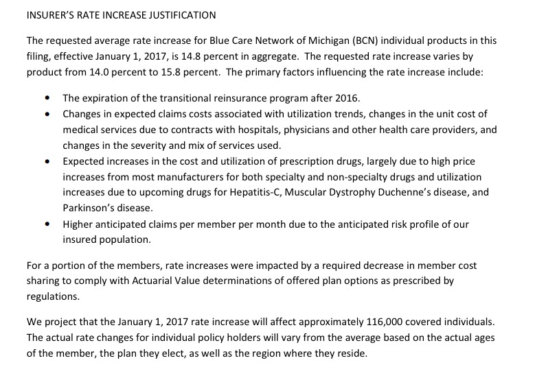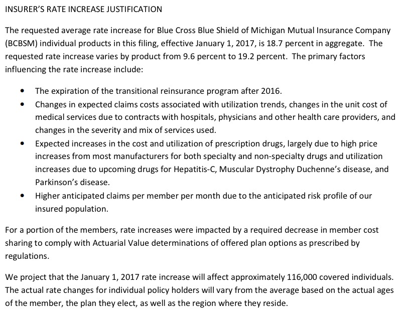 My home state of Michigan has finally published the "Part II - Consumer Justification Narrative" carrier filings for 14 of the 15 carriers offering individual market plans next year. The combined total number of current enrollees comes in at around 390,000 including both on and off-exchange numbers. Last year, Michigan had 560,000 people on the ACA-compliant individual market, so it's important to note that there's likely at least 170,000 people missing from this analysis. However, many of these are likely found here: