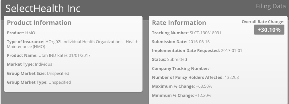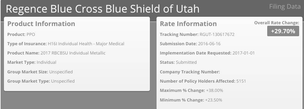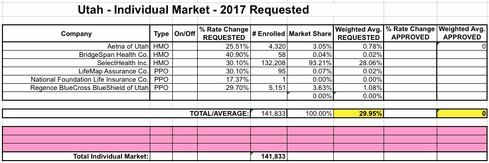 UPDATE 6/22/16: I've been informed that there was a coding glitch with Utah's website which prevented several carrier rate filings from being listed. I've gone back and plugged in the additional carriers, which account for about 32,000 more Utah residents...but which only moves the weighted average slightly, since Molina's request is fairly close to the 30% average I already had estimated.