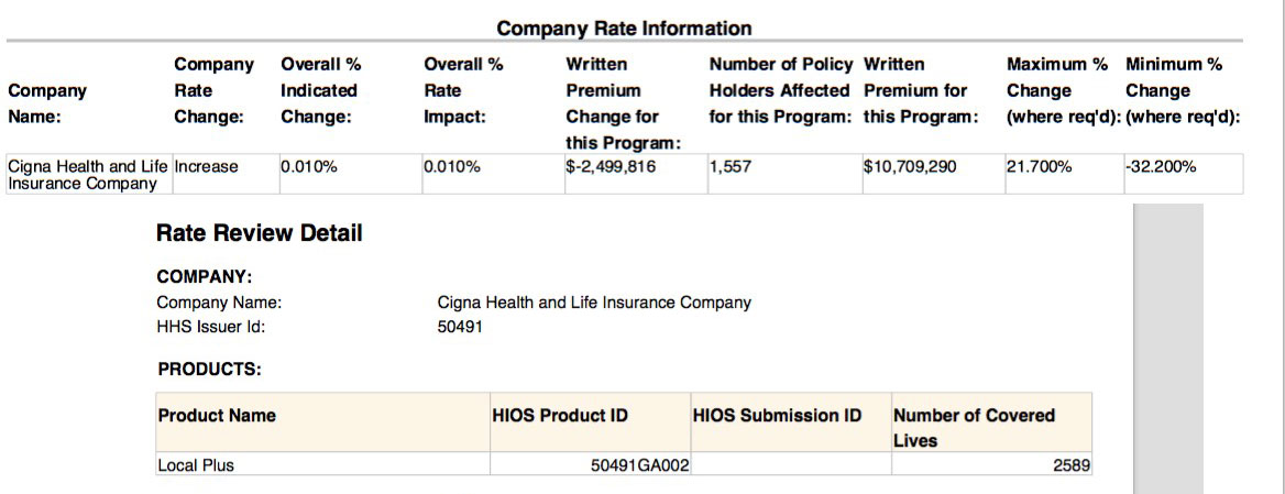 IMPORTANT: Please note that the Cigna filing appears to only be for off-exchange policies. Unless I'm missing something, it appears that Cigna is dropping off of the ACA exchange in 2017.