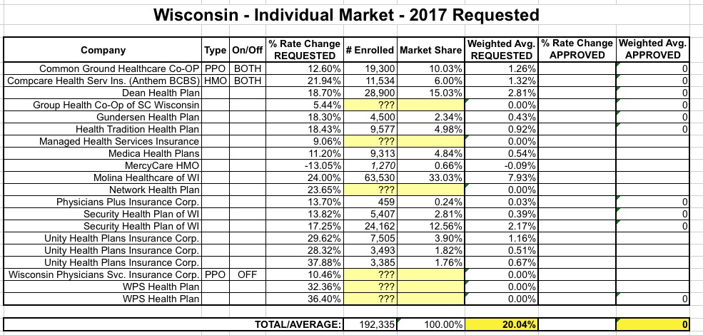 Wisconsin's total individual market was around 260,000 people in 2014 and is likely up to around 300,000 today (not including grandfathered/transitional enrollees), with about 224,000 enrolled on ACA exchange policies as of March 2016, plus an unknown number off-exchange. That means that the table below is likely missing around 1/3 of the total ACA-compliant market.