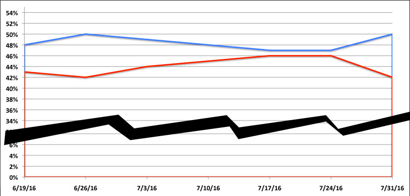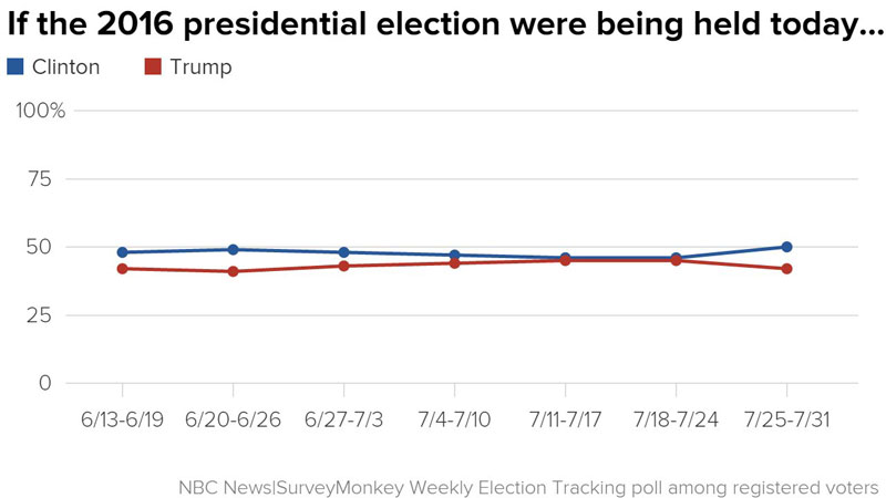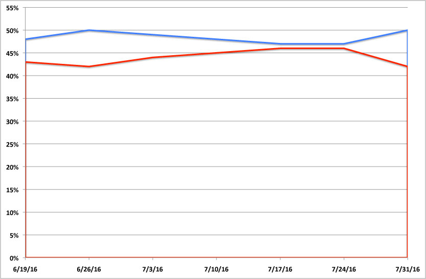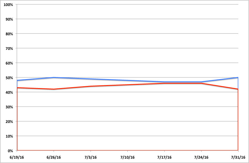 As Greg notes, this has the exact opposite effect of the Gallup charts: Instead of making the difference seem larger than it really is, by cramming in the full 100% range along the Y-axis, the SurveyMonkey tracking poll makes it look like Clinton and Trump are locked in a much tighter race than they actually are.