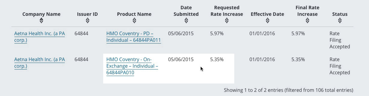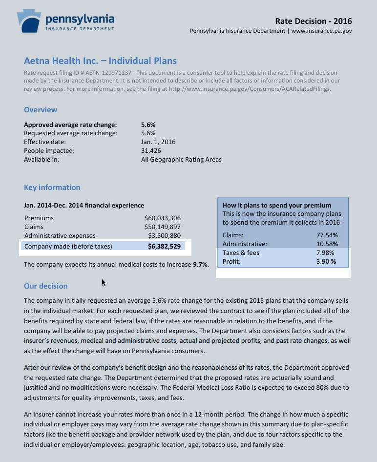 Now, it's possible that Aetna made the profit on off-exchange policies only in Pennsylvania last year, while losing money on their on-exchange enrollees. However, if that was the case, why did they only request a 5.6% average rate hike on their individual plans for this year? I don't mean what was approved by state regulators, I mean the rate filing initially submitted by the company itself?