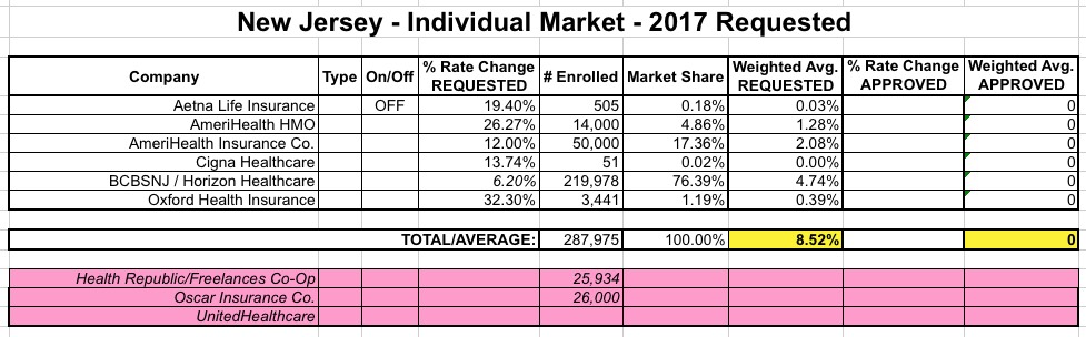 The two exchange-based carriers will be BCBS of NJ and AmeriHealth, plus Aetna, Cigna and Oxford off-exchange, it appears.