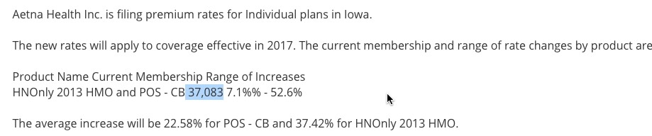 So really, this massive 38-43% rate hike officially impacts 30,000 people, or roughly 19% of Iowa's entire individual market. The hikes for the other 130,000 people (90K grandfathered/transitional, 40,000 via Coventry/etc) are still unknown.