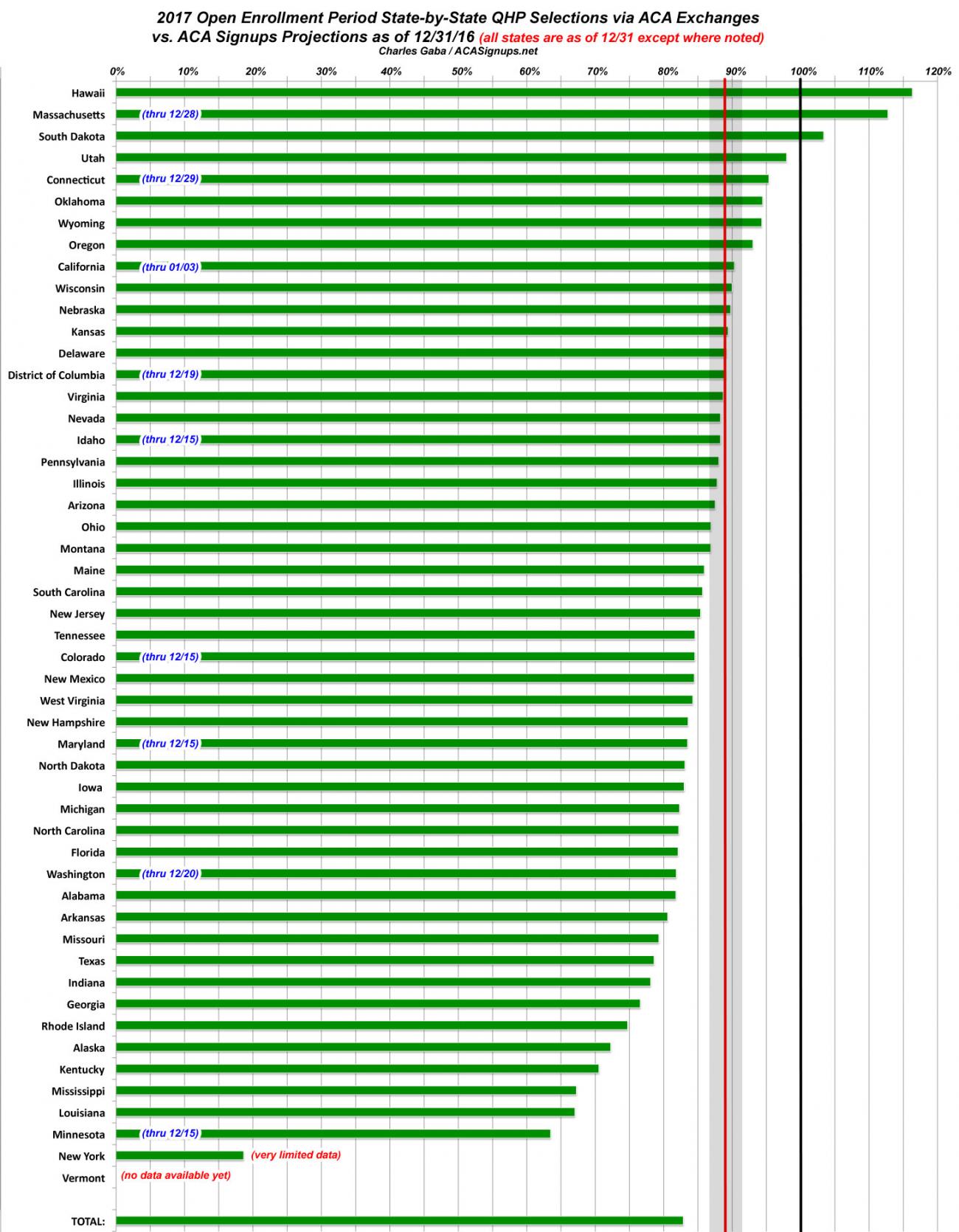 OK. Today saw fresh enrollment updates from Rhode Island (nominal), Covered California (impressive) and, most significantly, HealthCare.Gov (which not only covers 39 states, but also finally includes auto-renewals). I now have auto-renewal for 48 states + DC included in the mix, and the numbers are current through 12/31/16 or later for 41 of them. I still have no data whatsoever from Vermont (ironic, given their history of progressive healthcare policy, Bernie Sanders, etc), and only very limited data out of New York (they mentioned 55,000 enrollments over a 3-day period just ahead of the December deadline, but nothing from before or after that).