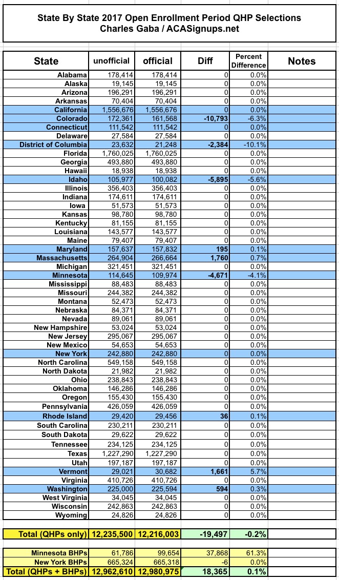 The "missing" enrollments are from Colorado, Idaho, Minnesota and DC, partly cancelled out by higher numbers from Massachusetts and Vermont, with nominal extras from Maryland, Washington State and Rhode Island. The Minnesota discrepancy is because MNsure tacked on an extra week for their SEP; it looks like those enrollments weren't included in the official total. In Idaho's case, I suspect that the 5,900 difference is made up of standalone dental plans (they didn't separate those out in an earlier report). Vermont and Washington are simply due to neither state having released hard numbers earlier.
