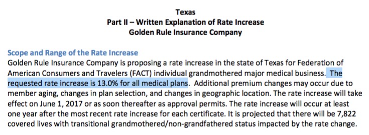 Golden Rule is requesting a 13% hike for 7,822 grandfathered enrollees: