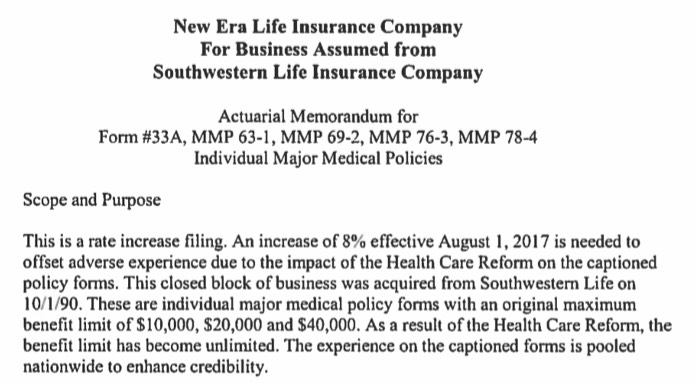 Here's an interesting one: New Era Life Insurance Co. has several filings for a nominal number of grandfathered enrollees (only a couple hundred people between the three, I believe). They're only asking for rate increases of 8.0 - 9.5%, but check out the description of the policies we're talking about: