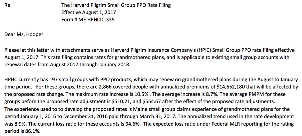 MAINE: Nothing major here, just noting that Harvard Pilgrim has filed rate increase for their transitional, small group policies effective August 1st: