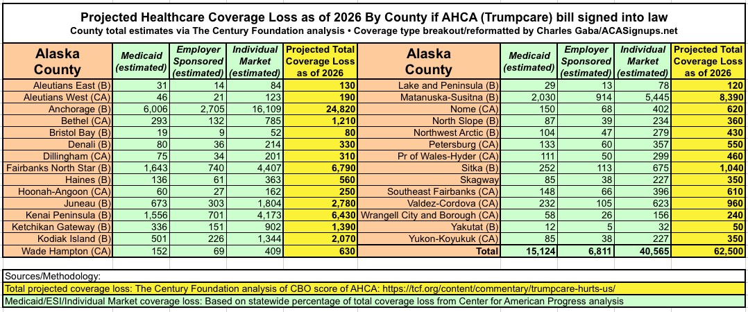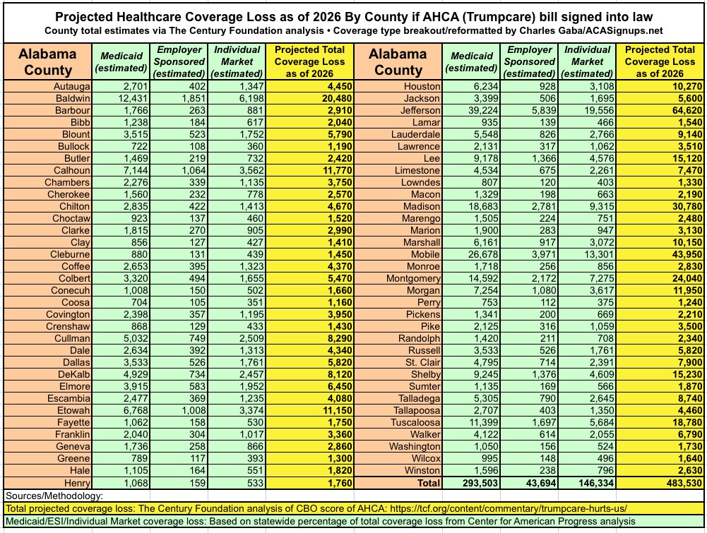 With that in mind, here's the County Level breakout of the Century Foundation's projections of how many people would lose healthcare coverage by 2026 under the GOP's AHCA bill. The yellow columns (Total) come directly from TCF's analysis; the green columns (type of coverage loss) are my own proportional estimates within those totals.