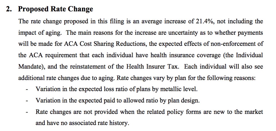 Cigna's filing hike request is a pretty ugly 42.1% overall...but they clearly state that a full 14.1 percentage points of this...or a solid third...is due specifically to Donald Trump and the Congressional GOP's threats to cut off the legally-owed Cost Sharing Reduction reimbursements due to the carriers. They also make a reference to Trump/Tom Price's threats not to enforce the individual mandate (by way of the increased morbidity profile expected for next year), but don't specifically break that part out. Without the CSR sabotage threat, however, they clearly state that they'd "only" be requesting a 28% increase (still ugly, but not as bad as 42%).