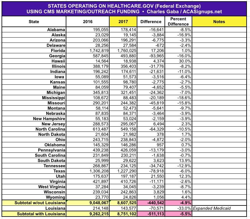 A week ago, Vox's Sarah Kliff reported that the Trump Administration was slashing the 2018 Open Enrollment Period advertising budget by 90% and the navigator/outreach grant budget by nearly 40%. As I noted at the time, the potential negative impact of these moves on enrollment numbers this fall--coming on top of the period being slashed in half, the CSR reimbursement and mandate enforcement sabotage efforts of the Trump/Price HHS Dept. and the general confusion and uncertainty being felt by the GOP spending the past 7 months desperately attempting to repeal the ACA altogether could be significant. In states utilizing the federal exchange (HealthCare.Gov), 2017 enrollment was running neck & neck with 2016 right up until the critical final week...which played out under the Trump Administration, which killed off the final ad/marketing blitz.
