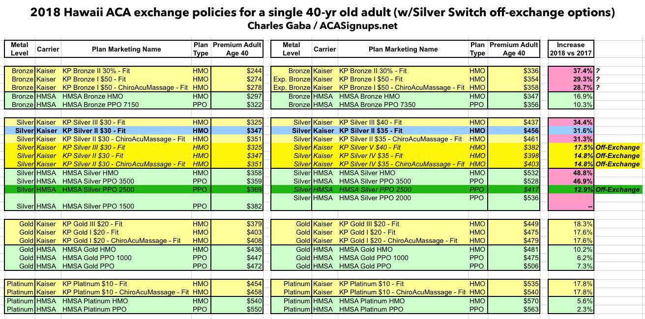 According to our CSR Load Load spreadsheet, Hawaii is supposed to be one of the 20-odd states using the full "Silver Switcharoo" strategy. It also has a single Rating Area, and only has two carriers (Kaiser and HMSA) participating in the individual market (on or off-exchange) anyway, making it a pretty easy state to run a full apples-to-apples year over year comparison.