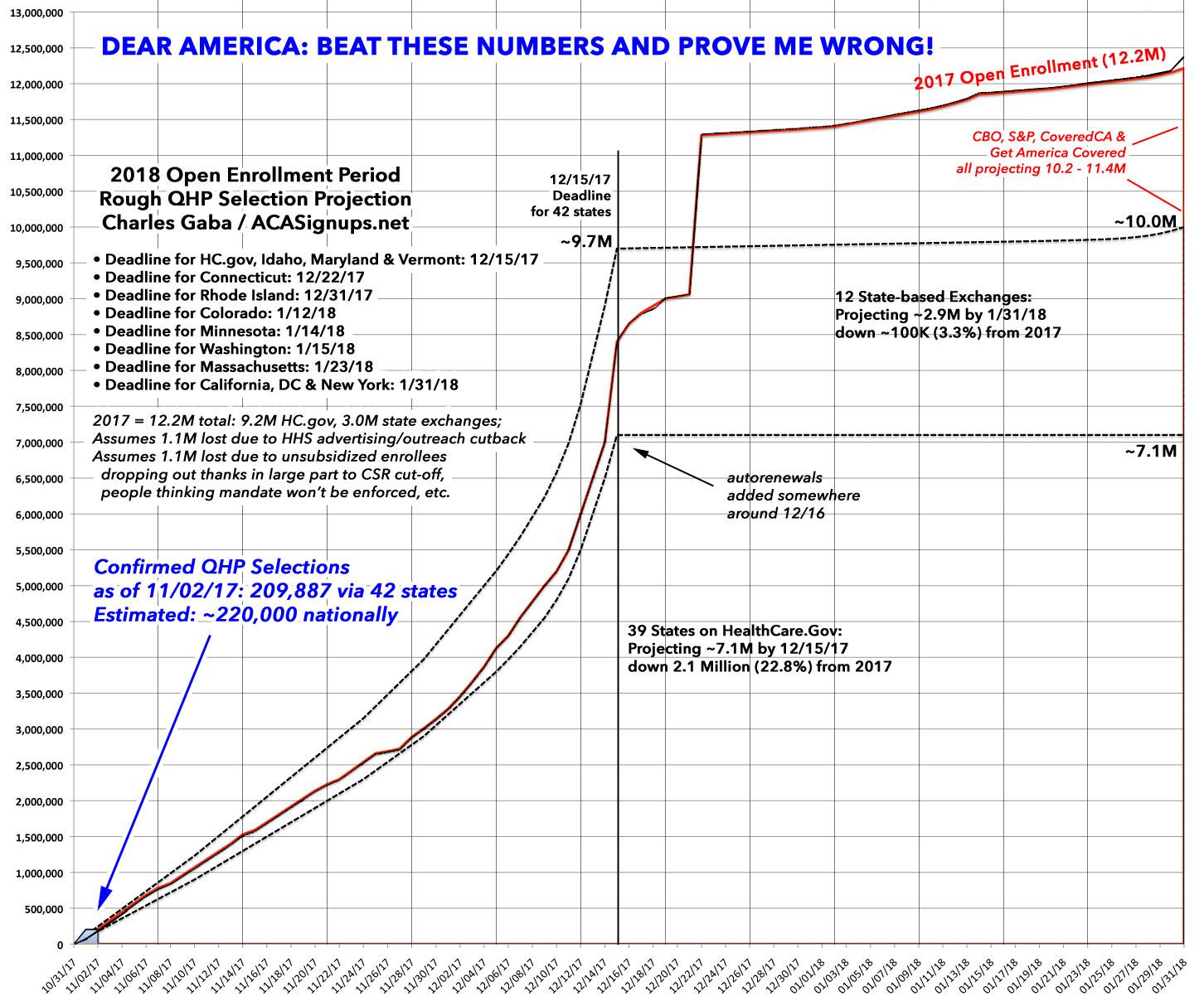 Now, it's way too soon to get too geeked about this; this could simply be a sign of people who would otherwise have signed up later on doing so earlier due to the shorter period and/or worries about the other insanity swirling around the process. If so, then the final numbers could still end up stinking (or mediocre at best). After all, enrollments were running neck & neck with (or even slightly ahead of) 2016 last year right up until the final week when the numbers dropped off a cliff, ending up half a million shy.