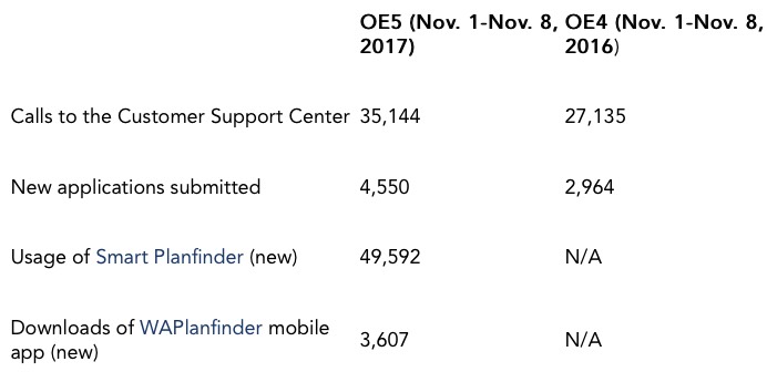 “We are very pleased to see this level of interest so early in open enrollment,” said Pam MacEwan, CEO of the Washington Health Benefit Exchange. “As with every new plan year, people need to review their health insurance options, and Washington Healthplanfinder is the most trusted place for Washingtonians to shop for and compare available plans. Many of our customers will qualify for tax credits that can lower the cost of coverage.”