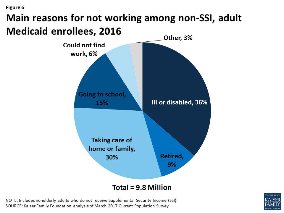 • Requiring work as a condition of Medicaid coverage would likely harm those who can’t work. The new CMS policy is grounded in the deeply flawed premise that Medicaid beneficiaries will find work if their Medicaid eligibility depends on it. However, more than one-third of Medicaid beneficiaries who aren’t working report that illness or a disability is the main reason, 28 percent report that they’re taking care of home or family, and 18 percent are in school. For these beneficiaries, a work requirement won’t likely help them find and keep a job — and losing Medicaid coverage won’t improve their economic mobility.