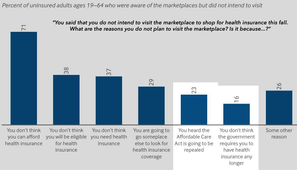 About half (47%) of uninsured adults were aware of the marketplaces but said they did not intend to visit them last fall to buy health insurance. When asked what the reasons were, 71 percent said they didn’t think they could afford coverage. About one-third said they didn’t think they would be eligible, while a similar share said they didn’t think they needed health insurance.