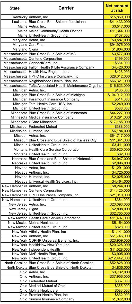 There's a lot of examples of this. And yes, I went ahead and went thorugh all 610 carrier listings and combined the various multiple entries for the same carrier to get this: A full listing of the net 2017 funds which carriers are at risk of losing (or at least of being frozen for awhile). I didn't bother with the other side of the coin, since those carriers aren't any worse off than they otherwise would be (at least in theory). All told, out of 610 listings, 184 carriers are actually owed money (fewer, really, if you only count national carriers once...Aetna, Inc. has listings in 25 states even after you combine the in-state divisions, for instance.