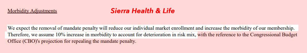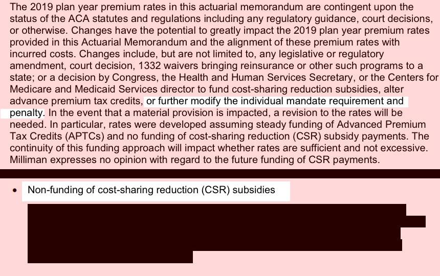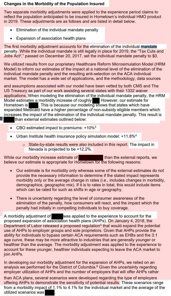Unfortunately, most of the critical data points are redacted in the filing screen shots below, but at least one carrier (Sierra Health) comes right out and states that they're using the CBO's 10% hike estimate as guidance for the individual mandate repeal impact, while another carrier (Hometown Health) blots out their numbers but makes it very clear that they're assuming a higher impact from mandate repeal and #ShortAssPlan expansion than the CBO or other estimates suggest.