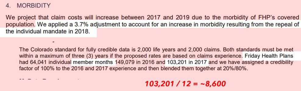 As you can see below, I don't have the hard enrollment numbers for some of the carriers, but the state insurance division has already done the weighted average calculation for me (5.94%). Several of the carriers specified how much they're raising rates due specifically to mandate repeal and/or #ShortAssPlans being expanded (10 points for HMO Colorado/Anthem and Rocky Mountain HMO, just 3.7 points for Friday Health Plans). The others didn't specify the impact, but most do mention it as a significant factor on rate hikes.