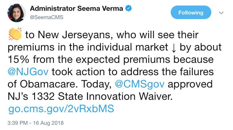 Bravo to New Jerseyans, who will see their premiums in the individual market drop by about 15% from the expected premiums because @NJGov took action to address the failures of Obamacare. Today, @CMSgov approved NJ’s 1332 State Innovation Waiver. https://t.co/xvX4kcVZLW