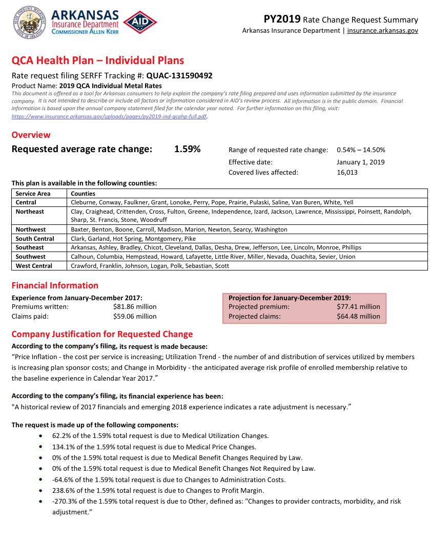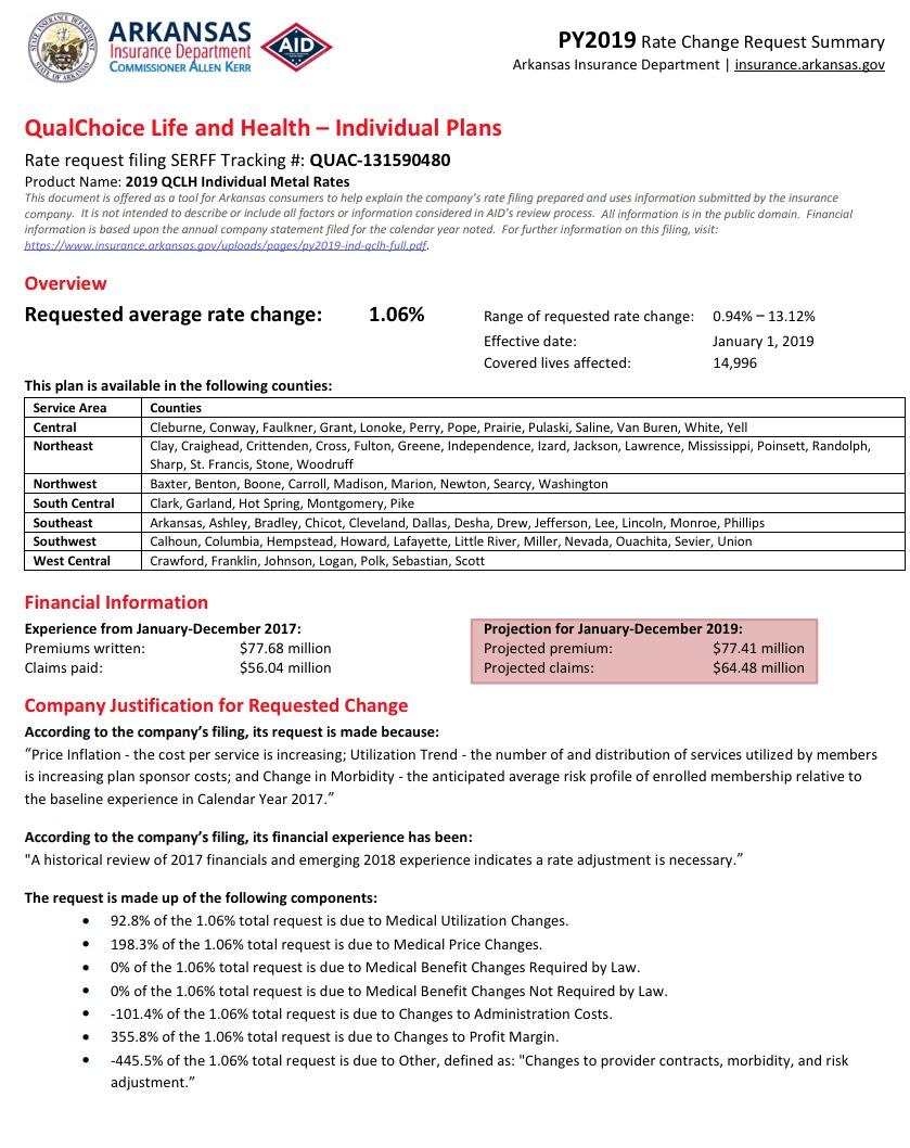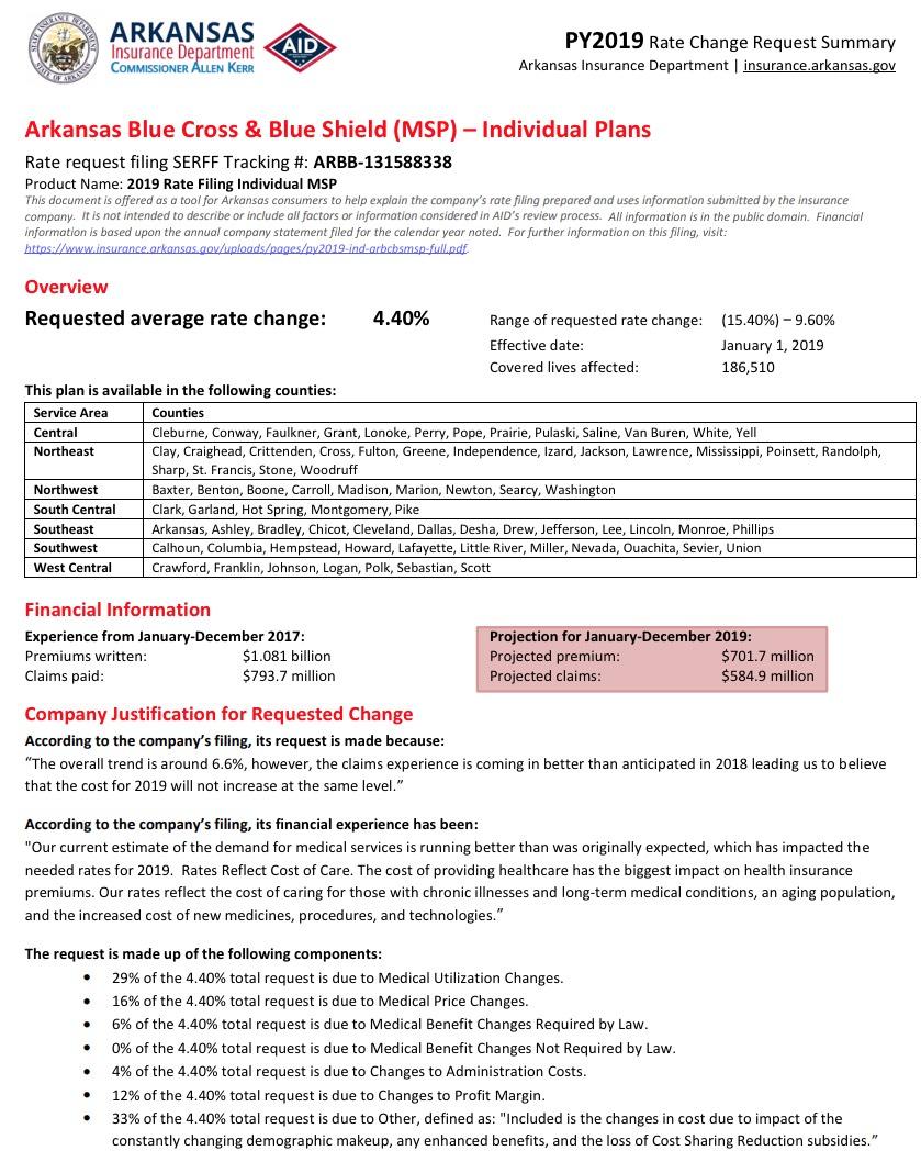 With the deadline for submitting 2019 rate filings having passed a week or so ago, the approved rates from the various state insurance regulators have been popping up left and right. Today I took a look at the Arkansas Insurance Dept. website and sure enough, they've posted the approved filings for all 4 carriers on the individual market (as well as the small group market).