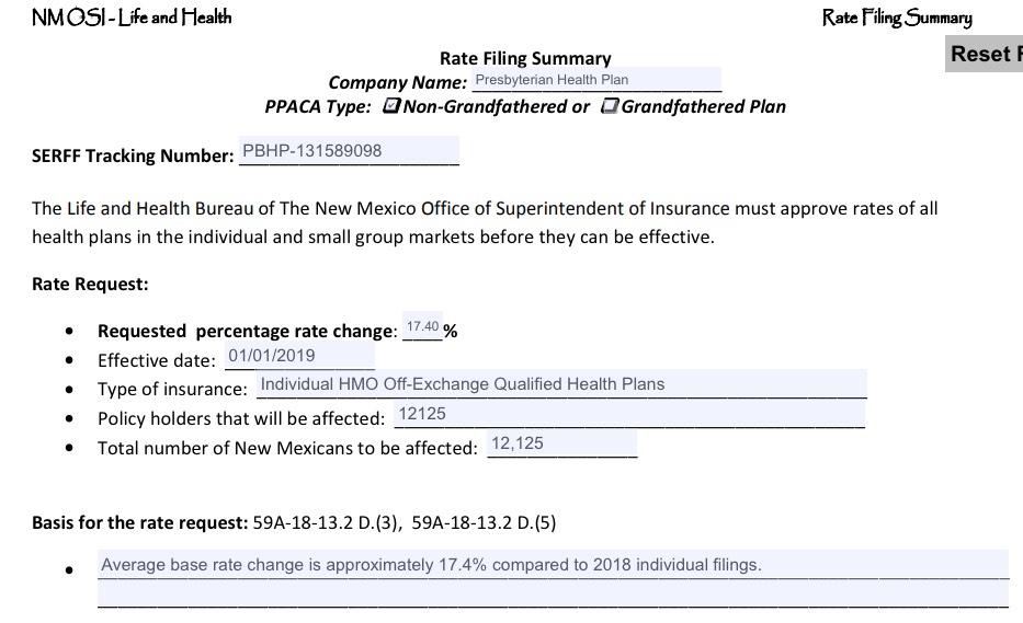 Huh. The surprising thing here isn't that the approved rate changes have dropped--that's pretty common after negotiations between the carriers and the state regulators. What's surprising is how much they've dropped. Plugging the data from the article into the spreadsheet gives a weighted average 0.6% increase, but the article itself claims a 1.0% net drop year over year for unsubsidized enrollees. I'm not sure what accounts for the discrepancy; it could be Presbyterian Health...the article states that they withdrew their proposal to join the exchange...but that still leaves them with over 12,000 off-exchange enrollees. As you can see in the filing screenshot below, they slightly reduced their request from 18.5% to 17.4%. From what I can tell, some of the screenshots come from the requested filings while others are from the approved versions.