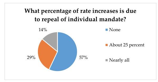 Among insurers planning to raise rates in 2019, 57 percent said there was no relationship between the repeal of the individual mandate in 2019 and their decision to increase premiums. Twenty-nine percent said the mandate’s repeal accounted for about 25 percent of their planned increase. Fourteen percent of insurers surveyed said the impact of the repeal accounted for all or nearly all of the planned increase in premiums.