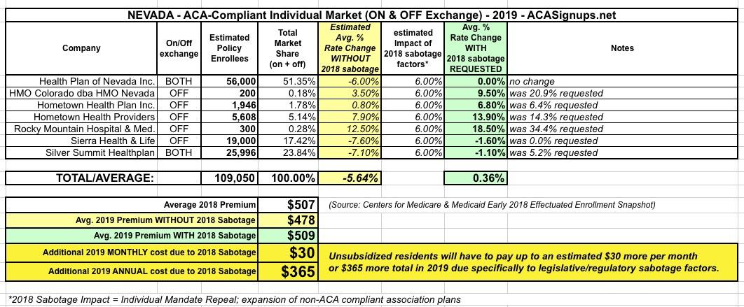 Unsubsidized Nevadans are paying $507/month this year on average, so that means they'll be paying roughly $30/month more next year (over $360 for the year) due specifically to GOP sabotage of the mandate and expansion of Association Health Plans (note that Nevada does have limited restrictions on short-term plans):