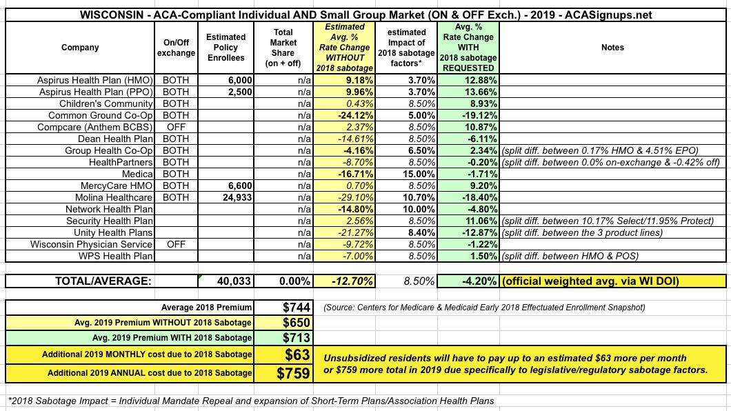 Wisconsin: APPROVED 2019 #ACA rate changes: 4.2% lower thanks to reinsurance, but WOULD have dropped by around 12.7% w/out #ACASabotage